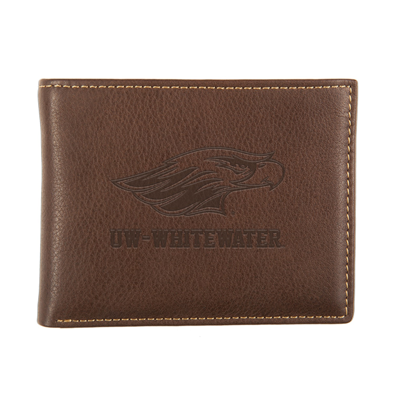 ID Holder - Brown Leather Stitch Bi-Fold Wallet with Imprinted Mascot over UW-Whitewater