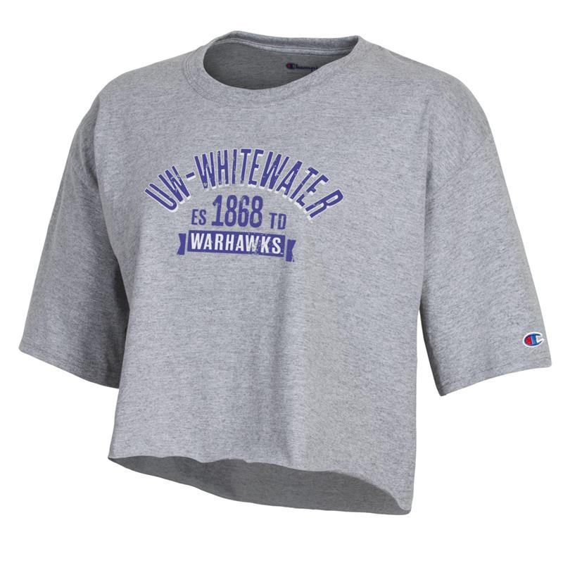 Image of Champion Women's Cropped T-Shirt with UW-Whitewater over Established 1868 over Warhawks in banner -  ash